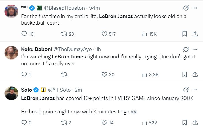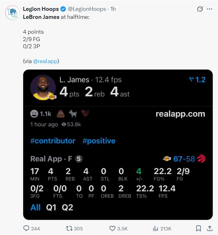 湖人球迷,自2007年1月以来詹姆斯每一场比赛都拿到10分,可这场比赛纪录中断了。