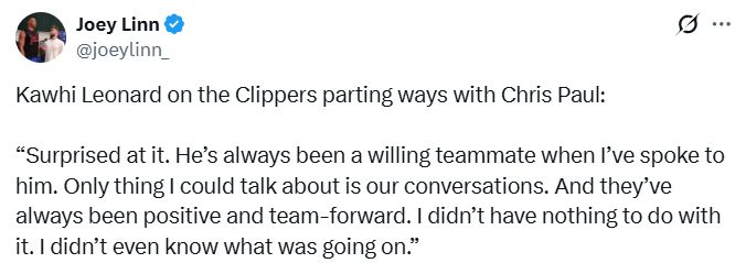 此前,快船将保罗深夜遣送回洛杉矶,并宣布将和他分道扬镳一事闹得沸沸扬扬。身为球队的核心之一,莱昂纳德也不可避免地被卷入相关流言。有报道称,莱昂纳德和哈登已经厌倦了保罗的啰嗦,对他离开球队感到“如释重负”。如今,莱昂纳德本人谈到了自己对此事的看法。