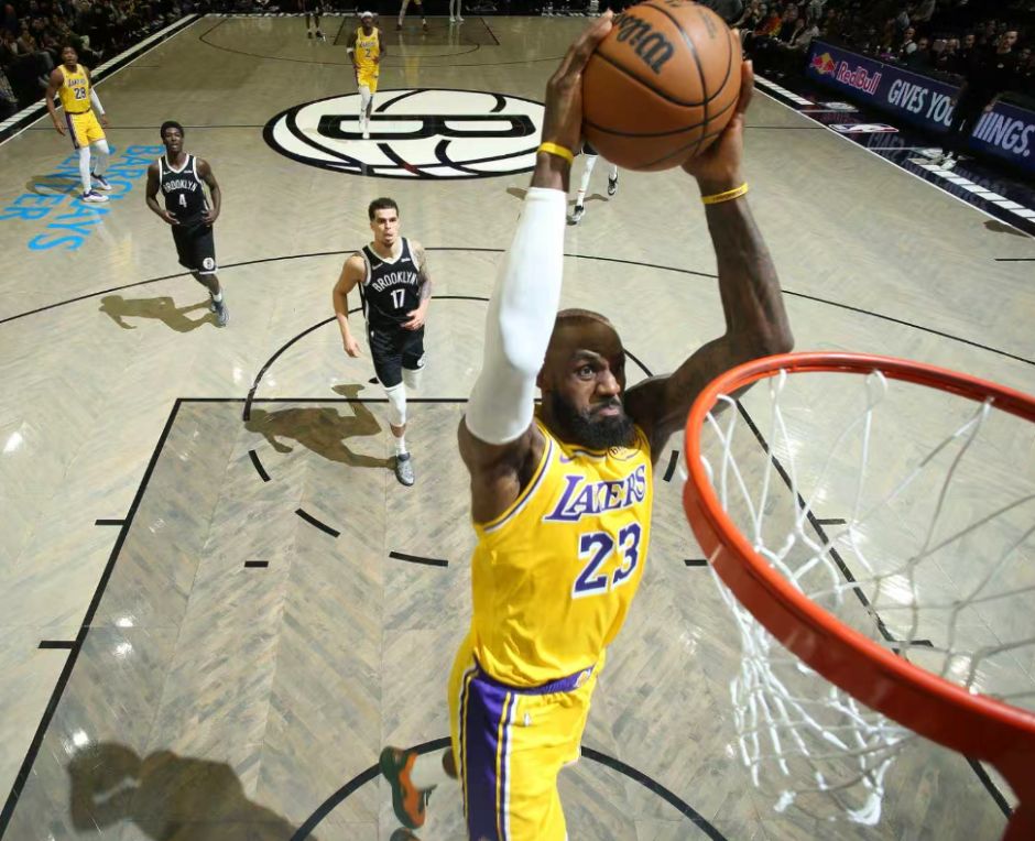 41岁的勒布朗罚球线里一步飞身暴扣。