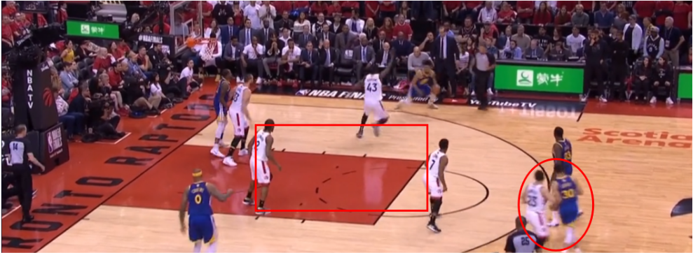 在猛龙对阵勇士的总决赛里,纳斯教练祭出的“BOX-ONE”,其余4名球员是传统的2-2防守阵型,2名防守球员站在罚球线附近的区域,另外两个站在禁区附近的区域,形成一个类似盒子的方形。当对方投篮之后,5名球员需要积极拼下篮板球,形成快速反击。